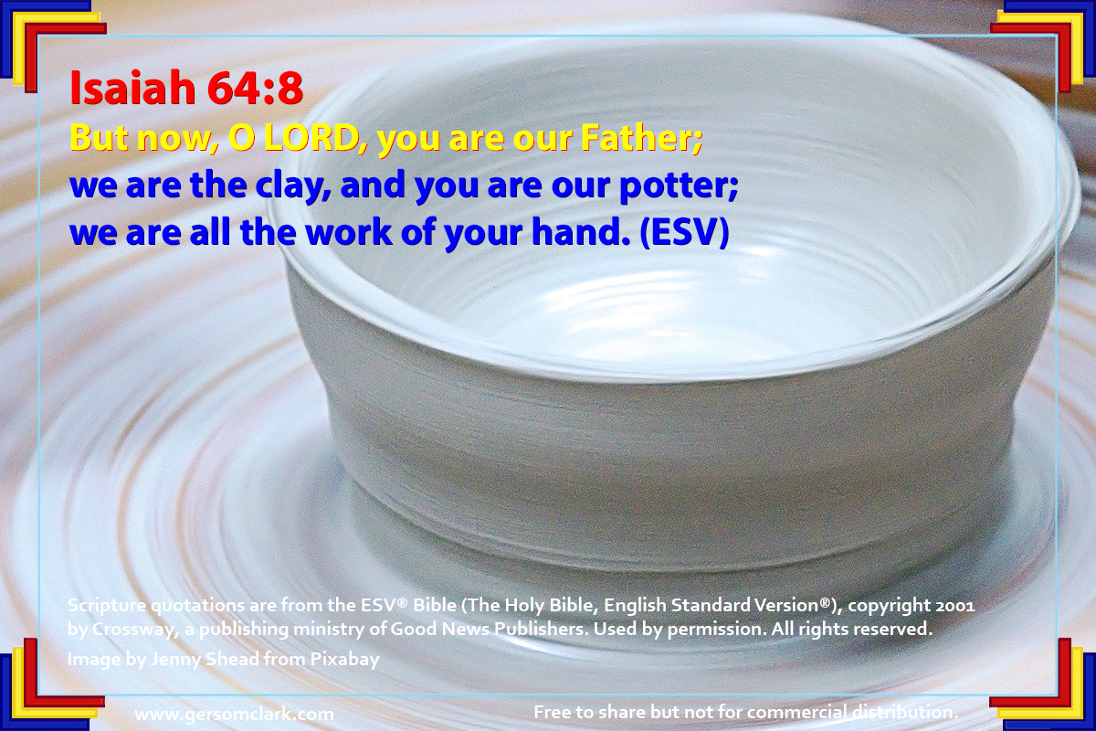 Good morning from the Philippines, Bettie! GOD molds us according to His purpose and for His glory! This particular verse inspired the song, “Change My Heart O GOD.” Praying for you! Be strong, knowing that the Triune GOD sustains us, gives us the strength and the will to praise Him everyday! Keep in touch! GOD bless you and your family! May the good Lord inspire your to draw the 2nd book.