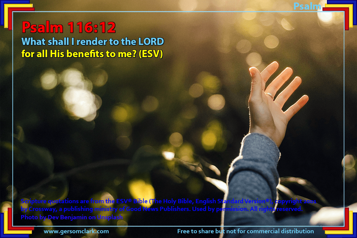 November 10, 2024 November 10, 2024November 8, 2024 by Gersom Clark, posted in Bible Verses “I know there’s no way to repay You; only to offer You my praise.” Share this: Click to share on X (Opens in new window) X Click to share on Pinterest (Opens in new window) Pinterest Click to email a link to a friend (Opens in new window) Email Click to share on Reddit (Opens in new window) Reddit Click to share on Tumblr (Opens in new window) Tumblr Click to share on WhatsApp (Opens in new window) WhatsApp Like Loading... Related